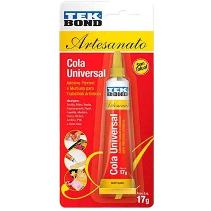 | Local de Uso | Super cola universal 17g Tekbond É super resistente à água e óleos convencionais. Proporciona montagens e colagens de alto desempenho com qualidade, oferecendo excelente resistência à desmontagem É uma cola transparente, viscosa, feita a partir de copolím |