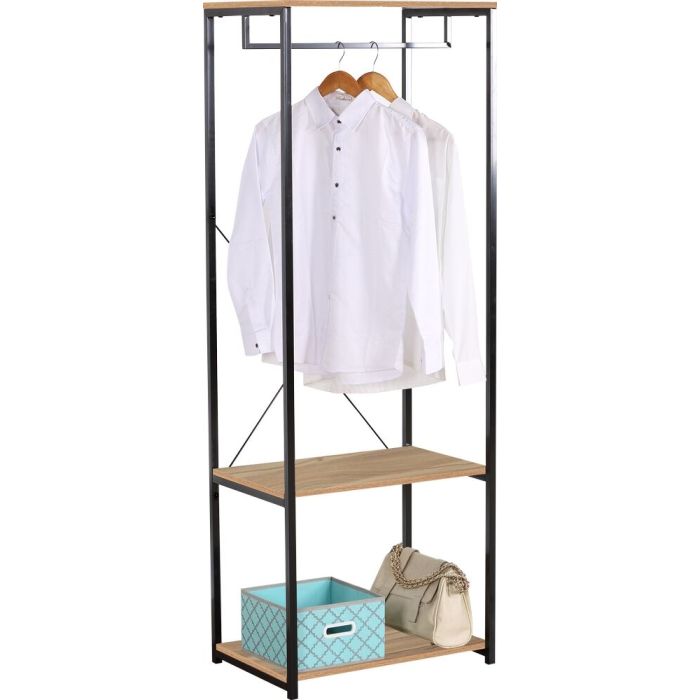 Resistente, funcional, prática e oferece elegância onde estiver. Possui suporte para cabides e duas prateleiras para guardar organizadores e caixas. Feito em uma combinação de aglomerado de carvalho e aço preto.