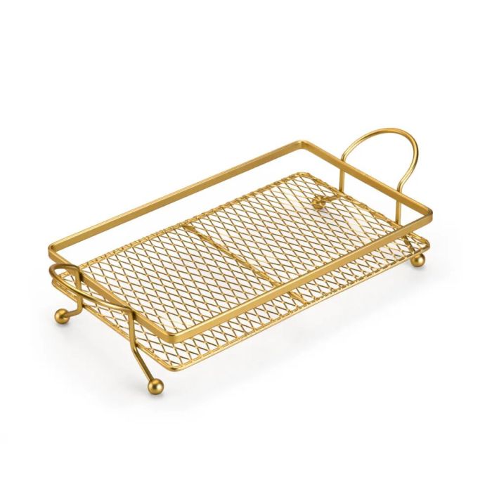 Com acabamento em dourado fosco, a bandeja possui visual elegante e contemporâneo, combinando facilmente com diferentes estilos de decoração. Seu formato retangular e estrutura delicada proporcionam equilíbrio entre modernidade e requinte, tornando-a perfeita para valorizar qualquer espaço, do banheiro à sala de estar.