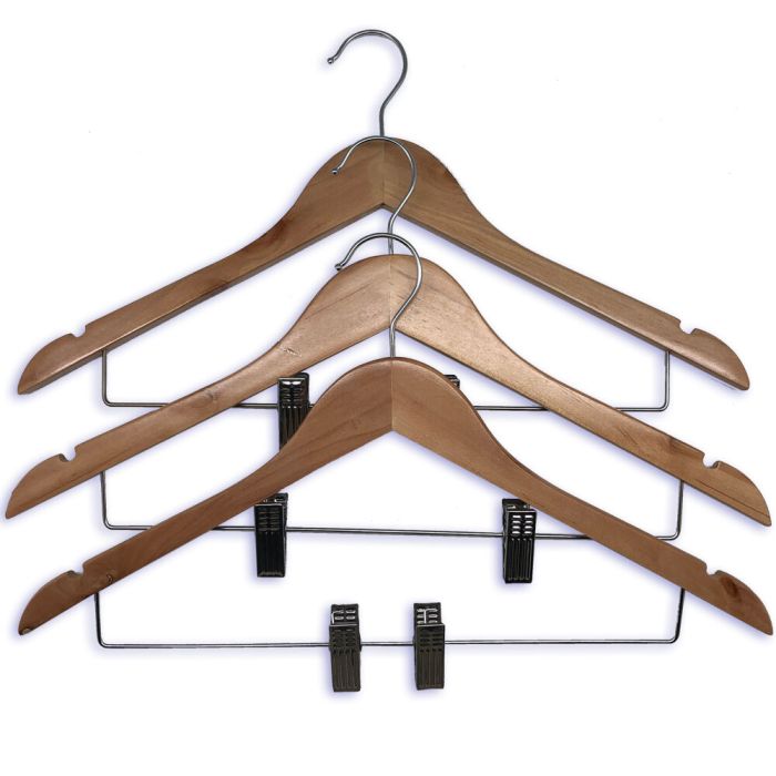 Cabide de Madeira com presilha é fabricado em madeira com gancho de metal, o que faz dele um modelo bem resistente e ideal para roupas pesadas como casacos, ternos. Seu design clássico é perfeito pra quem gosta de qualidade e elegância, sendo a melhor maneira para organizar lojas, quarto, guarda-roupa e closet.