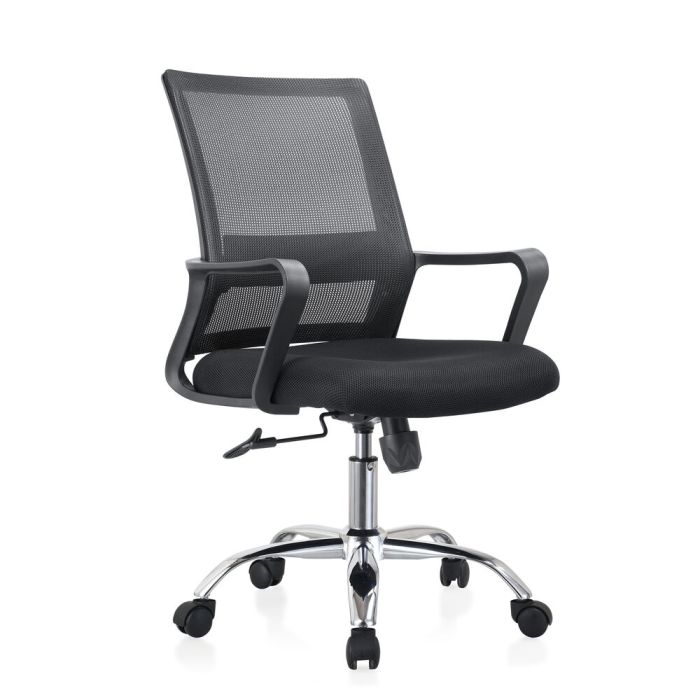 A cadeira de escritório é preta, uma escolha comum para móveis de escritório, proporcionando um visual clássico e profissional. O assento sendo revestido de malha, espuma e madeira ajuda no seu conforto, a cadeira possui braços, proporcionando apoio adicional e conforto para os braços do usuário enquanto trabalham. Sua altura é ajustável, permitindo que o usuário a ajuste de acordo com sua altura e preferência, o que é essencial para a ergonomia e o conforto. As dimensões da cadeira são 57 centímetros de largura, 58 centímetros de profundidade e 101 centímetros de altura. Isso inclui a largura do assento, a profundidade total da cadeira e a altura total.