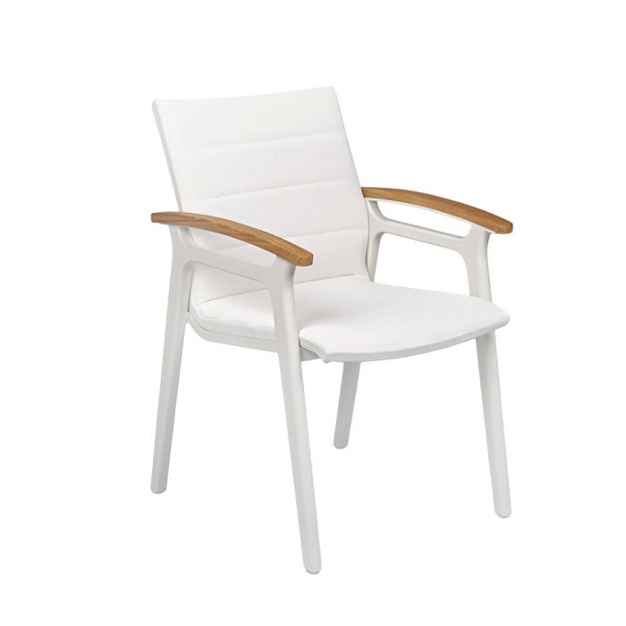 Fabricada em alumínio off white com textilene acolchoado, a cadeira garante durabilidade e conforto. Os braços em madeira teca adicionam um toque natural e elegante, enquanto os pés slim conferem leveza ao design.