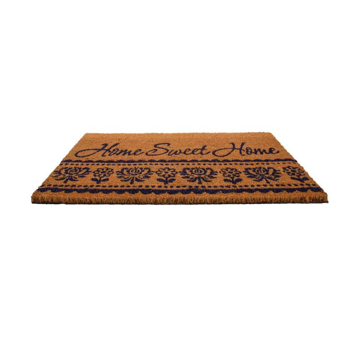 O capacho de fibra de coco é durável e resistente, proporcionando uma recepção charmosa e funcional. A combinação de cores e a mensagem "Sweet Home" tornam sua entrada mais aconchegante.