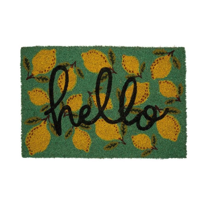 Um capacho resistente para a entrada de sua residencia ou estabelecimento comercial para limpar os sapatos e evitar que a sujeira seja trazida para o interior. O capacho com estampa "Hello Lemon" tem uma medida de 40x60cm, com um design animado que apresenta limões em amarelo e letras em preto que formam a palavra "Hello".