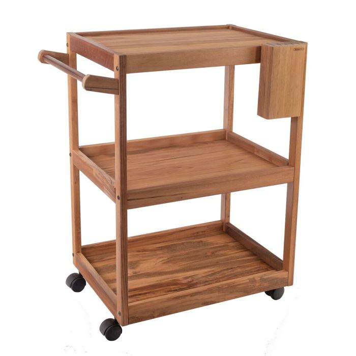 | Informações Adicionais | Produzido em madeira Muiracatiara FSC; Acompanha um cepo para facas. Com acabamento em óleo mineral, proporcionando durabilidade e proteção ao produto. O carro possui rodízios e é entregue desmontado, com manual de montagem e kit de parafuso |