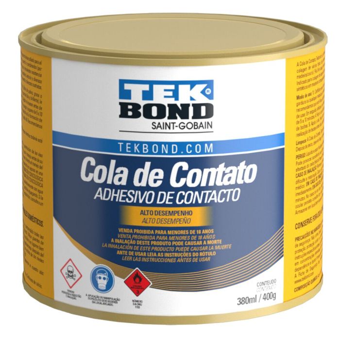 | Informações Adicionais | A Cola de Contato Tekbond é um adesivo de contato à base de borracha de policloropreno desenvolvido para a colagem de vários tipos de materiais entre si (ex.: madeira-madeira; couro-couro) ou combinados (ex.: madeira-couro). Fácil de usar, oferece secagem rápida, boa resistência à água e excelente resistência inicial. Indicada para a colagem de laminados decorativos, pisos de borracha, couro, metais, lambris e diversos materiais sintéticos em madeiras compensadas, aglomerados, MDF e diversos substratos |