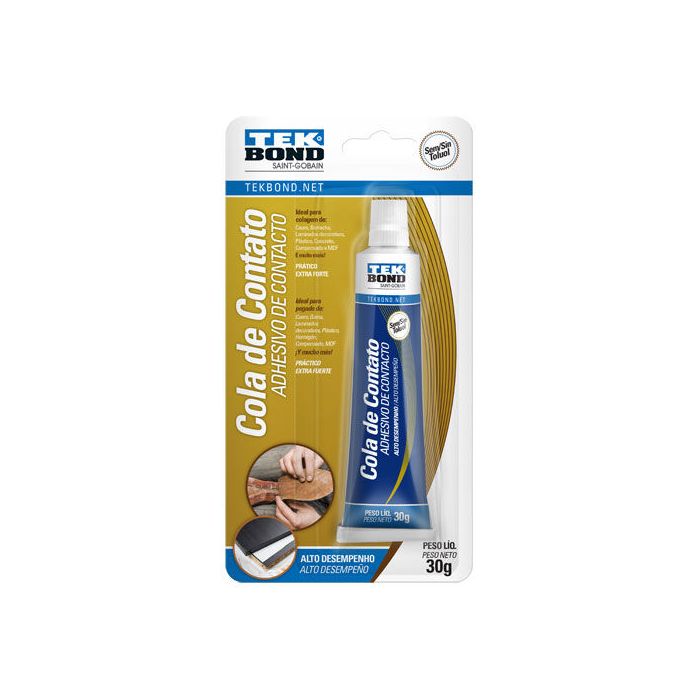 | Local de Uso | Cola de contato 30g Tekbond Fácil de usar, oferece secagem rápida, boa resistência à água e excelente resistência logo de início. Adesivo a base de borracha de Neoprene, desenvolvido para colagens de alto desempenho em diferentes materiais |