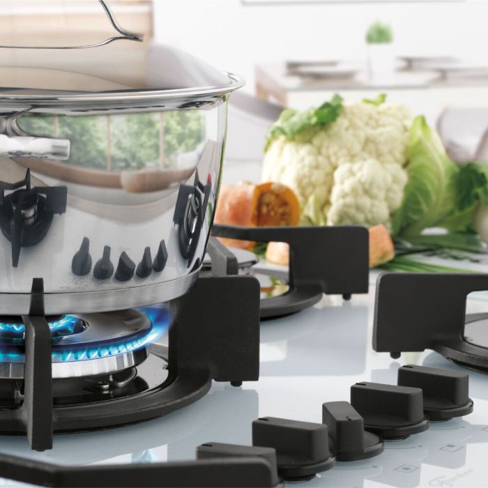 São 5 queimadores com tecnologia italiana de alta eficiência e durabilidade, sendo: 1 queimador tripla chama (3700W), 1 queimador rápido (3000W) e 3 queimadores semirrápidos (1630W), todos com a câmara de gás fechada, ou seja, a chama não se apaga com facilidade.