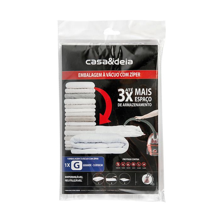 A Embalagem a Vácuo Casa&ideia, com dimensões de 55x90cm, é uma solução prática e eficiente para o armazenamento de diversos itens. Ideal para roupas, cobertores, edredons e outros tecidos volumosos, esta embalagem reduz significativamente o espaço ocupado, facilitando a organização e o armazenamento.