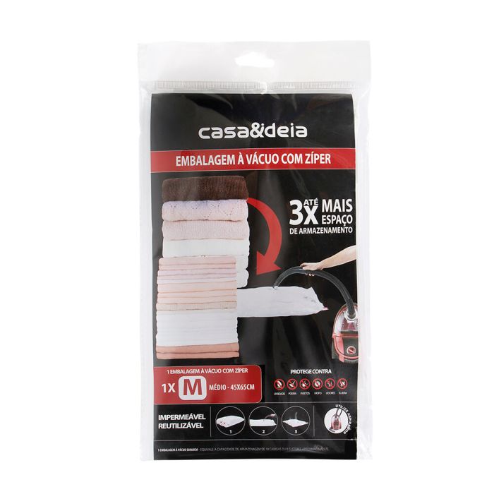 Ao usar o sistema de vácuo, esta embalagem reduz o volume dos itens armazenados, protegendo-os contra poeira, umidade, insetos e odores indesejados.