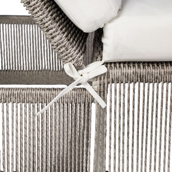 - Material: Estrutura em alumínio, laterais em rattan sintético cinza e almofadas em textilene.