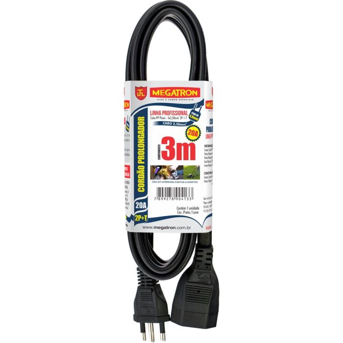 A Extensão 3X2,50mmX3,0m PP Plano 20A Preto Megatron é um produto de qualidade e que garantem segurança aos usuários, atendendo ao novo padrão brasileiro de plugues e tomadas (NBR 14136).