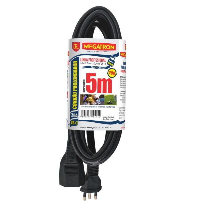 A Extensão 3X2,50mmX5,00m PP Plano 20A Preto Megatron é um produto de qualidade e que garantem segurança aos usuários, atendendo ao novo padrão brasileiro de plugues e tomadas (NBR 14136).