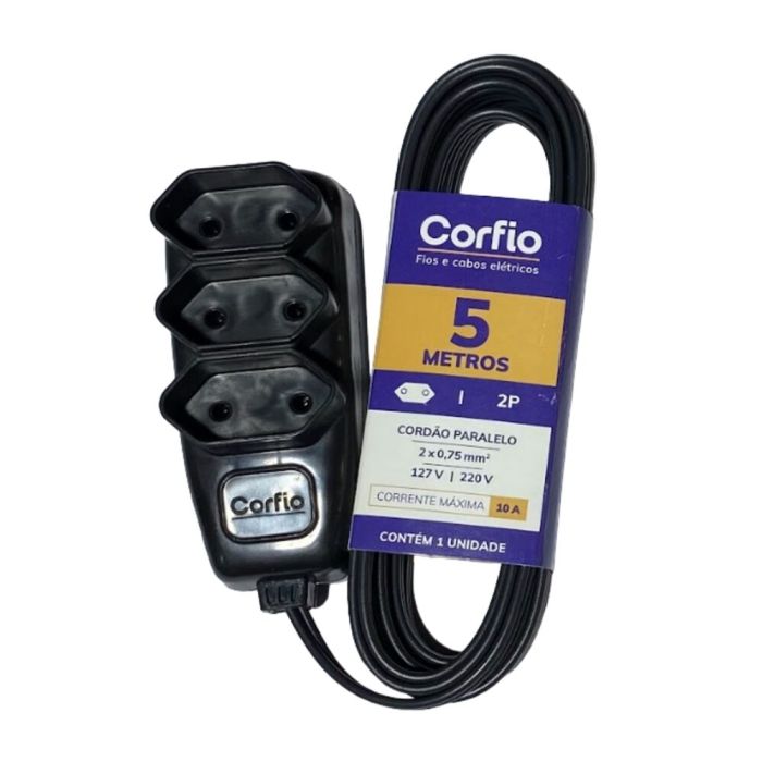 A Extensão 5m 10A 2P da Corfio é uma solução prática para quem busca qualidade e segurança no uso de aparelhos elétricos. Com design compacto e discreto na cor preta, é ideal para conectar até três dispositivos ao mesmo tempo em tomadas bivolt.