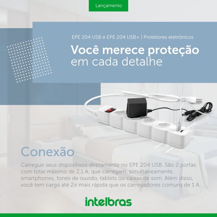 | Informações Adicionais | O protetor eletrônico EPE 204 USB tem 4 tomadas e 2 portas USB para conectar e carregar seus dispositivos sem preocupações. Ele está disponível na cor preta ou branca, e com 1 ou 3 metros de cabo. Além disso, o EPE tem dupla proteção com chave inteligente contra curto-circuito e sobrecarga, e varistor contra surtos de tensão. |