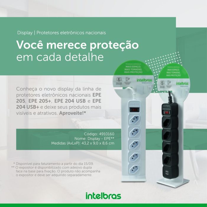 | Informações Adicionais | O protetor eletrônico EPE 204 USB tem 4 tomadas e 2 portas USB para conectar e carregar seus dispositivos sem preocupações. Ele está disponível na cor preta ou branca, e com 1 ou 3 metros de cabo. Além disso, o EPE tem dupla proteção com chave inteligente contra curto-circuito e sobrecarga, e varistor contra surtos de tensão. |