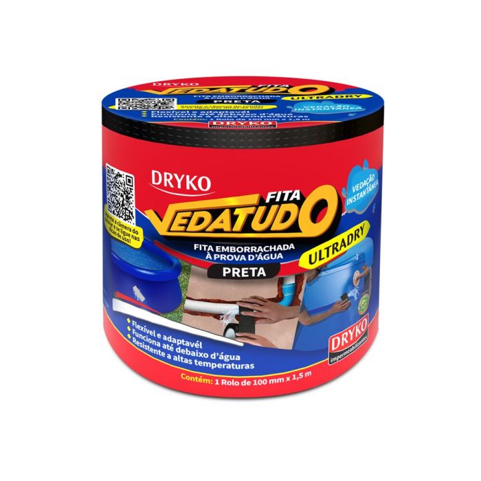 A Fita Vedatudo Ultradry Dryko é indicada para vedação e reparos em diferentes superfícies, oferecendo praticidade e eficiência na aplicação.