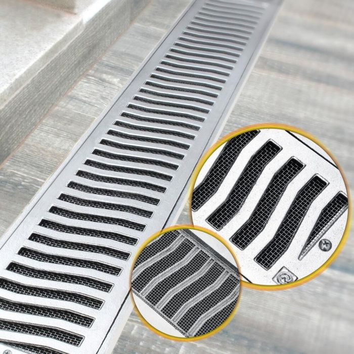 | Informações Adicionais | O conjunto em alumínio é formado por grelha leve especial e porta-grelha na medida de 15x100 cm, no acabamento martelado cromado, utilizado na captação de água. Possui tela anti-inseto e animais peçonhentos. |