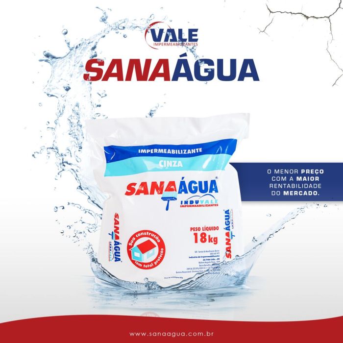 O Impermeabilizante Sana Água 18kg Cinza Induvale é composto de cargas minerais especiais cristalizantes em pó, que aplicados em qualquer estrutura de alvenaria ou concreto molhado, penetram na porosidade dos materiais cristalizando-se em contato com a água da infiltração, formando uma impermeabilização duradoura do local com acabamento rústico.