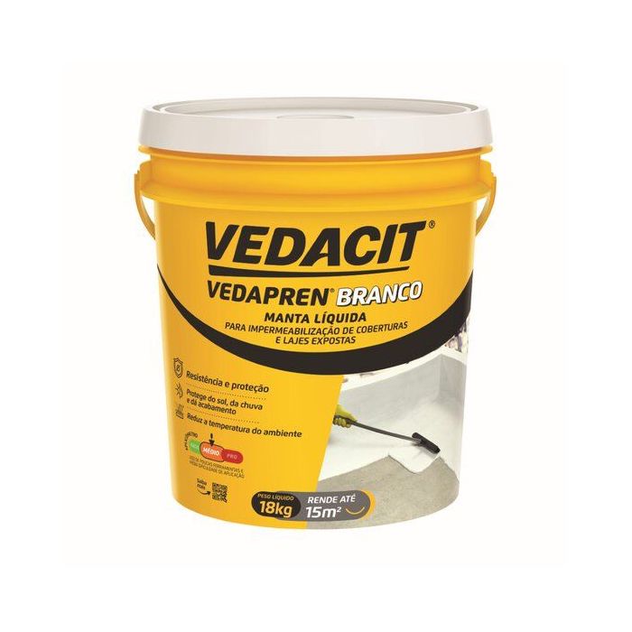 | Informações Adicionais | VEDACIT VEDAPREN BRANCO* é uma manta líquida, de base acrílica e aplicação a frio sem emendas, pronta para uso e moldada no local. Cobre a estrutura com uma proteção impermeável e apresenta ótimas características de elasticidade, flexibilidade e aderência, tendo uma grande durabilidade e alta resistência a intempéries. Proporciona excelente acabamento, além de refletir os raios solares, o que reduz parte do calor absorvido pela estrutura. VEDACIT VEDAPREN BRANCO dispensa proteção contra os raios solares. |