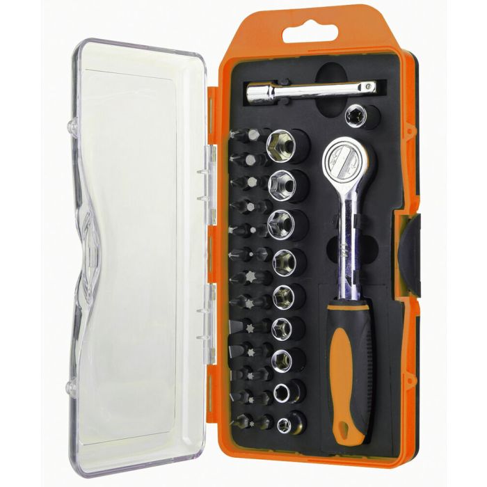 | Conteúdo da Embalagem | Chave Catraca Philips:0,1,2,3 Pozidriv:0,1,2,3 Fenda:3mm,4mm,5mm,6mm,7mm Hexagonal:2mm,3mm,4mm,5mm,5.5mm,6mm Torx:T10,T15,T20,T25,T27,T30,T40 9 peças Soquete: 5mm,6mm,7mm,8mm,9mm,10mm,11mm,12mm,13mm, 1 extensor 70mm Bar, 1 extensor 70mm, 1 peça Acoplador Chave Catraca. |