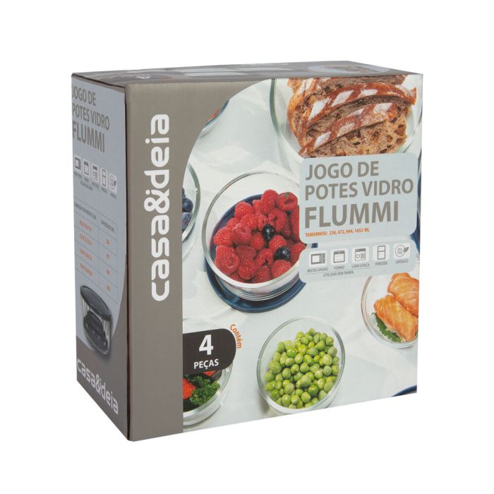 | Conteúdo da Embalagem | Jogo de potes de vidro com 4 potes de tamanhos diferentes: 236ml, 472ml, 944ml e 1652ml. |
