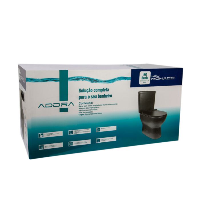O Kit Bacia com Caixa New Monaco 3/6L Black Matte Addra oferece uma solução completa para o banheiro, com um design moderno, recursos de economia de água, fácil instalação e manutenção, além de componentes duráveis e de alta qualidade.Características
