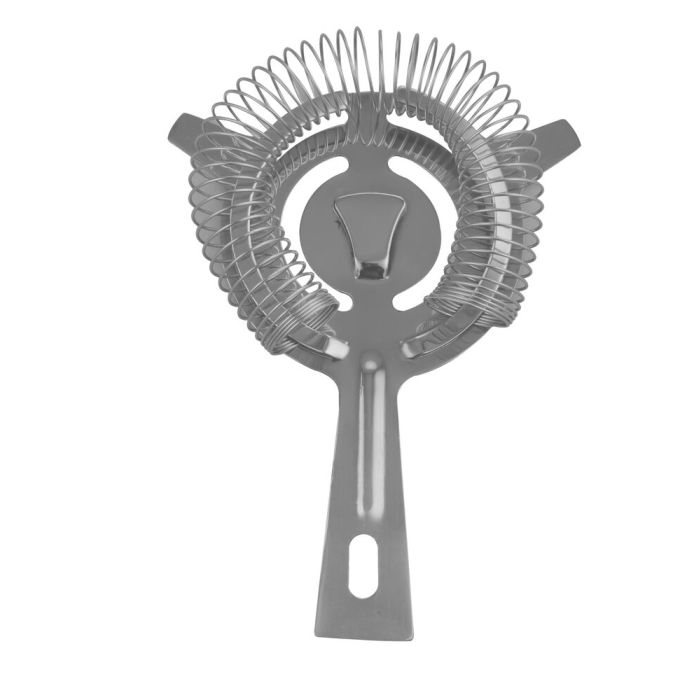 Coador 4,3x7cm(LxA): É um utensílio utilizado para filtrar a bebida ao servida no copo, evitando que haja partículas de gelo e os ingredientes sólidos presentes na coqueteleira entrem no copo de servir. Ele possui uma estrutura com furos ou uma malha fina que retém os sólidos e permite a passagem apenas do líquido.