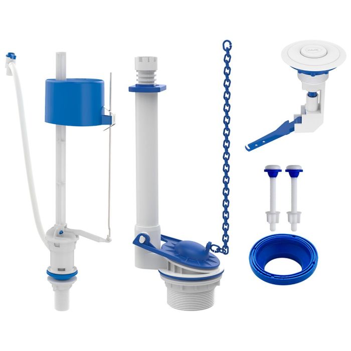Compatível com diversas marcas e modelos de caixas acopladas, o kit inclui um conjunto de válvula de entrada de água, uma válvula de saída de água, parafusos, vedante e acionador.