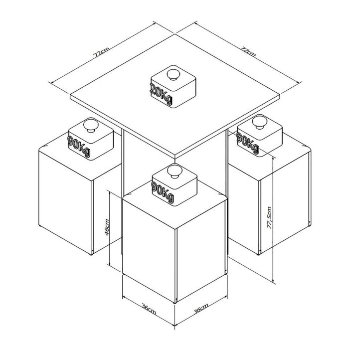 As dimensões do conjunto são ideais para pequenas áreas. A mesa tem altura de 77,5 cm, largura de 72 cm e profundidade de 72 cm, proporcionando uma superfície adequada para refeições e outras atividades. As banquetas têm altura de 45,5 cm, largura de 36 cm e profundidade de 36 cm, oferecendo assentos confortáveis e espaço interno para armazenamento.