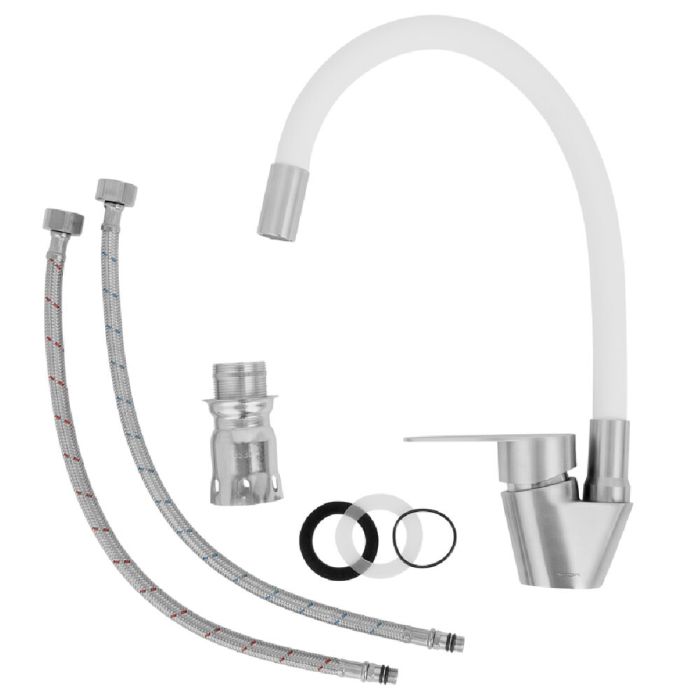 Torneira Misturador Monocomando para Cozinha de Mesa Bica Alta 1/2" Fluir Flex Neo Branca Aço Inox Addra