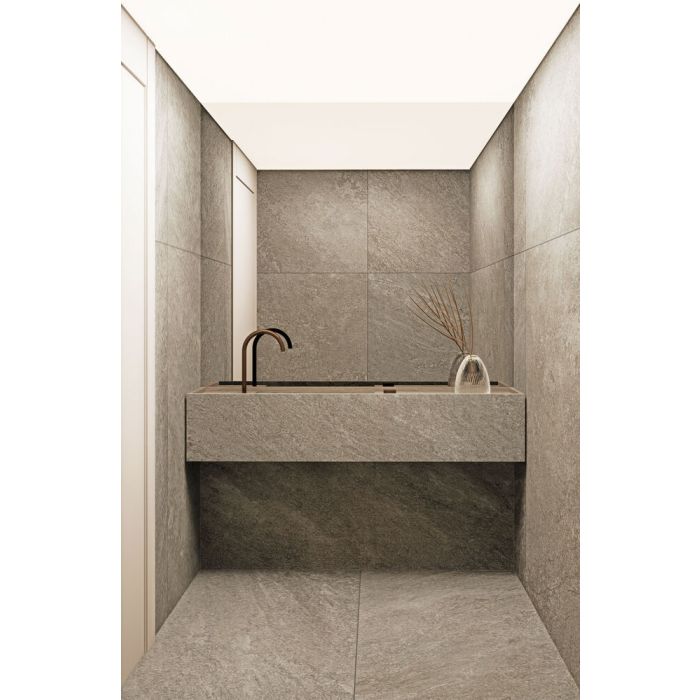 Com superfície texturizada e relevos digitais, o porcelanato proporciona um acabamento diferenciado que simula com perfeição a rusticidade da pedra natural, oferecendo beleza e autenticidade ao ambiente.