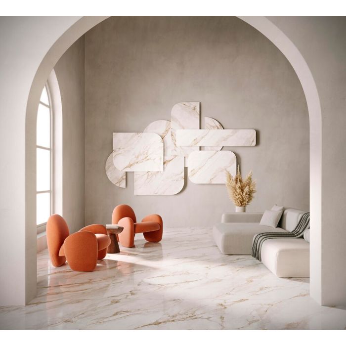 Com seu grande formato de 120x120 cm, o Porcelanato Marmo Perla Lux minimiza as juntas entre as peças, criando um efeito visual contínuo e ampliando os espaços. Este formato é especialmente indicado para áreas amplas, como salas de estar, halls de entrada e espaços comerciais, proporcionando um design fluido e uniforme.