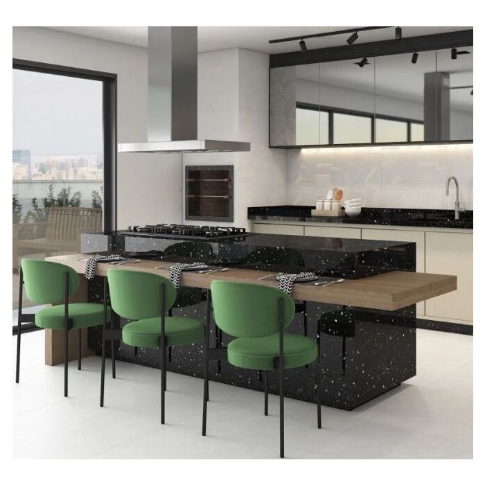 A peça é formada por fragmentos de materiais que criam uma estética única, com grânulos de diferentes tamanhos e cores que se misturam à massa, proporcionando um efeito visual homogêneo em todo o corpo do revestimento. Isso garante que, ao ser cortada ou recortada, a peça mantenha a mesma aparência tanto na superfície quanto nas bordas.