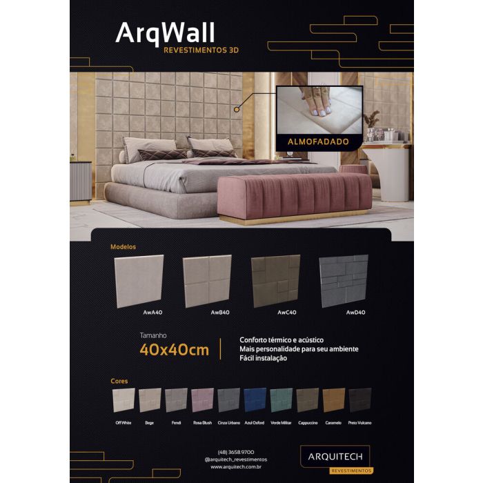 Mais personalidade para seu ambiente Revestir paredes proporcionando conforto térmico, acústico e visual. Confere ao ambiente textura de tecido e efeito visual 3D, criando novos ambientes dependendo do local que o mesmo for instalado. Fácil instalação Podem ser instalados em madeira, mdf, alvenaria, ou qualquer outra superfície que esteja limpa, sem umidade e suporte o peso do produto. Em ambientes internos como salas, quartos, cabeceiras de cama entre outros ambientes conforme a necessidade de conforto ao toque, conforto acústico e transformação visual de ambiente.