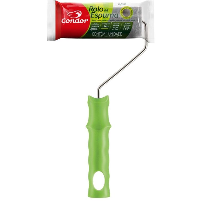 O Rolo de Espuma com Garfo 9cm 983 Condor composto de espuma cinza 100% poliéster, sendo ideal para superfícies metálicas e madeira lisas com tintas látex, óleo, esmalte, acrílica e vernizes.