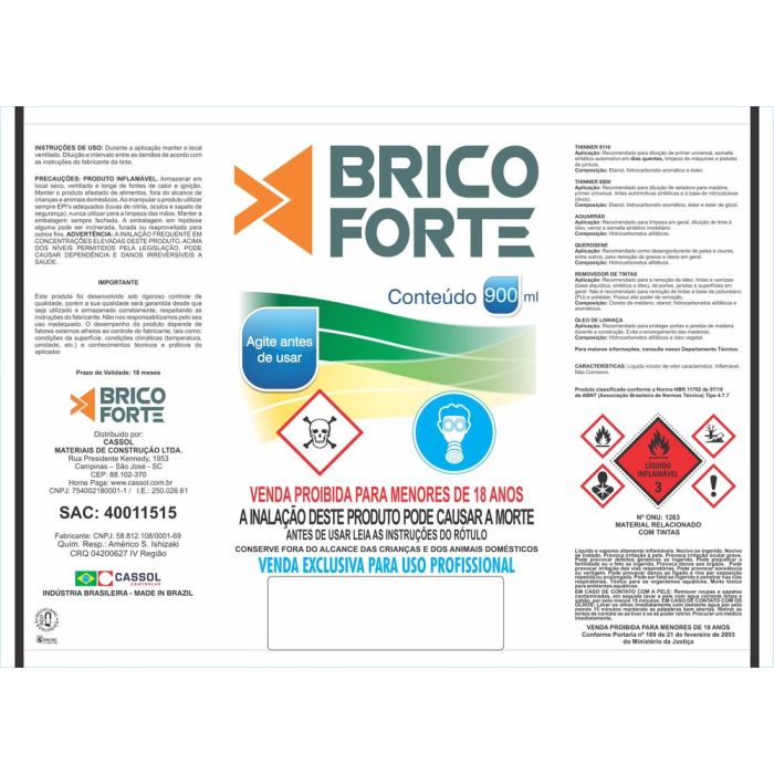 | Conteúdo da Embalagem | Solvente Aguarrás 900ml Brico Forte |