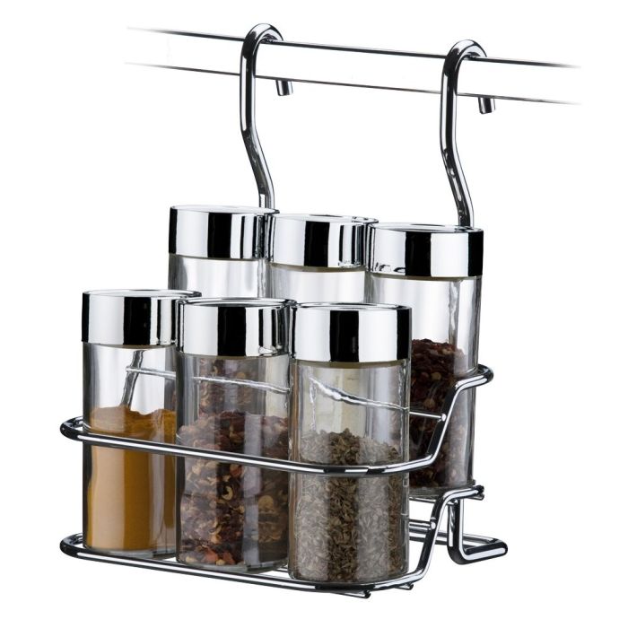 | Conteúdo da Embalagem | 1 Suporte em aço cromado (14x14x19acm), 6 Potes de vidro 90ml (10cmax4cmø), 6 Tampas plásticas metalizadas, 6 Dosadores plásticos com furos de 5mm |
