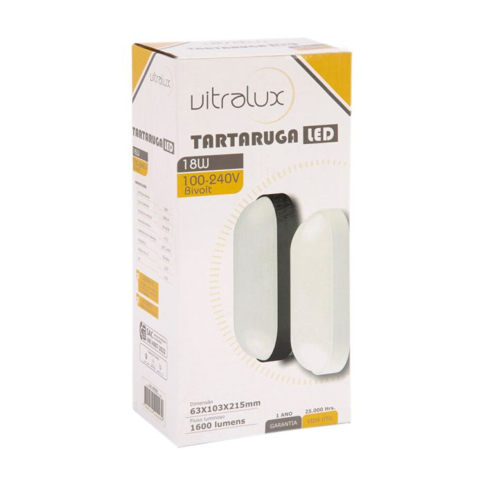| Conteúdo da Embalagem | Tartaruga LED 18W 3000K Luz Amarela Vitralux |