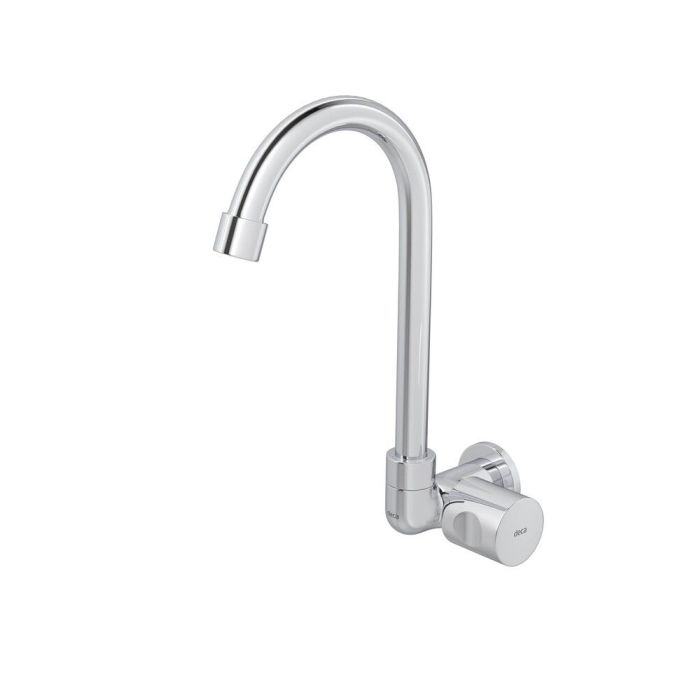 A linha Aspen da Deca foi desenvolvida para oferecer funcionalidade e estilo ao ambiente. Esta torneira de parede possui bica alta e móvel, facilitando o uso diário, especialmente em pias maiores ou com cubas duplas.